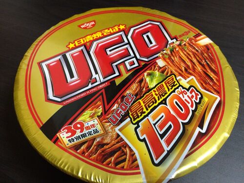 今日は雨。 強弱を付け、雨が降り続いた佐賀市。 その分、気温は低め。 今日の仕事終わりはこちら。 「日清焼そばU.F.O. 39周年特別限定品」 先だってのどん兵衛特別限定品と同時発売。 こちらの特徴は、 「U.F.O.史上最高濃度130%ソース」 中身は液体ソース…