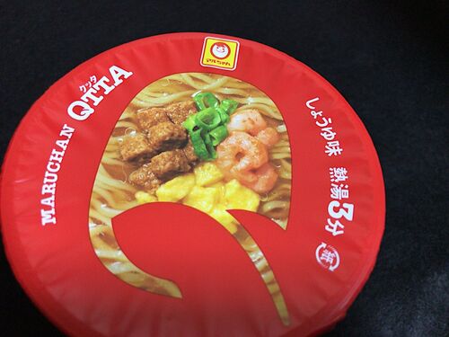 今日の仕事終わりはこちら。 「MARUCHAN QTTA(クッタ)SHO-YUラーメン」 3月27日、 東洋水産より新発売。 全3種で色味の良い赤、青、緑。 それぞれ醤油、シーフード、豚骨。 ローマ字表記が、 訳の分からぬ感を加速(苦笑) 面白いのはパッケージ。 側面はゴ…